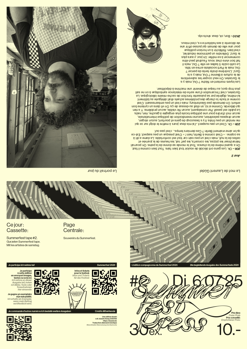 À l’occasion du Summerfest 2025 (4-5-6/07), festival de musique annuel à Biel/bienne, nous avons publié un fanzine par jour accompagné d’une cassette audio.